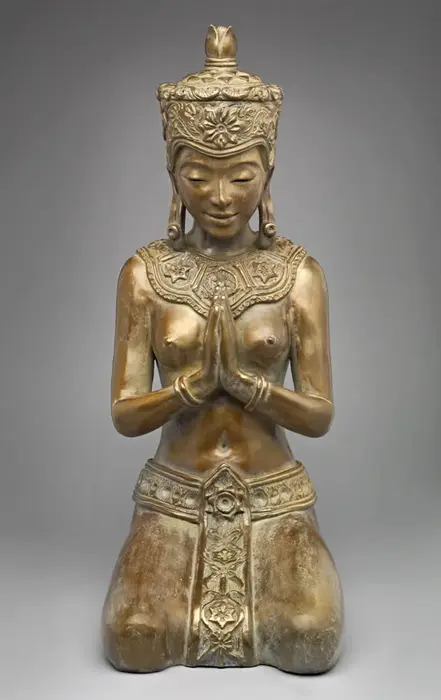 The Cambodian Temple Goddess kneels in a gesture of reverence, hands pressed together in anjali mudra, a sign of greeting, offering, and spiritual devotion across Buddhist and Hindu traditions.
